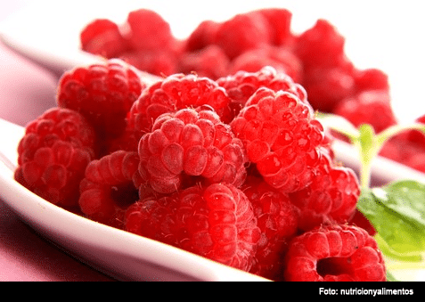 4. Frambuesas: Tienen una gran concentración de vitamina E y muy pocas calorías. Esta vitamina aporta luminosidad al rostro. La frambuesa contiene vitaminas del grupo B que ayudan al metabolismo y favorecen el crecimiento. Además es anticancerígena, aumenta las defensas y gracias a su contenido en fibra, posee propiedades digestivas